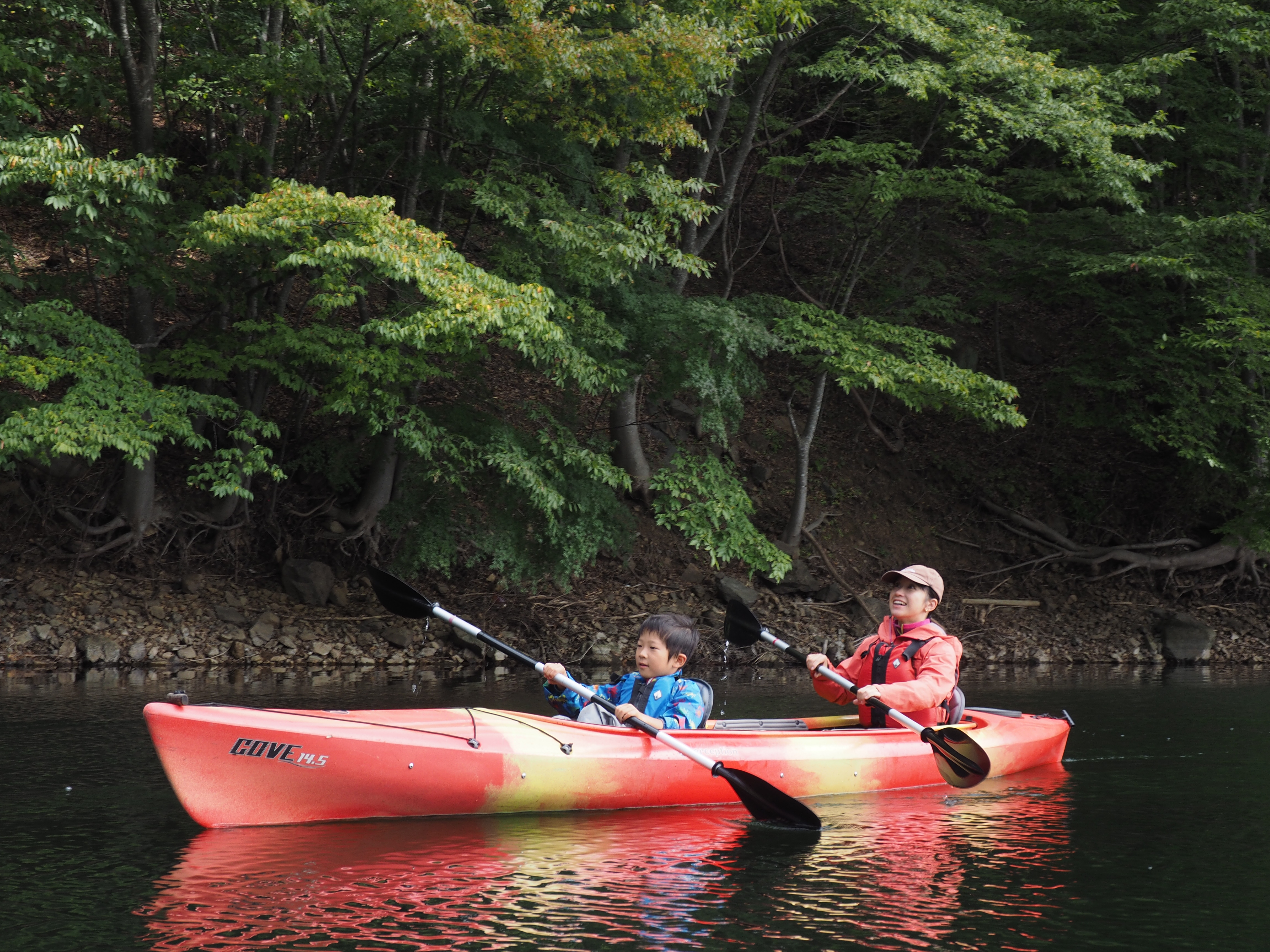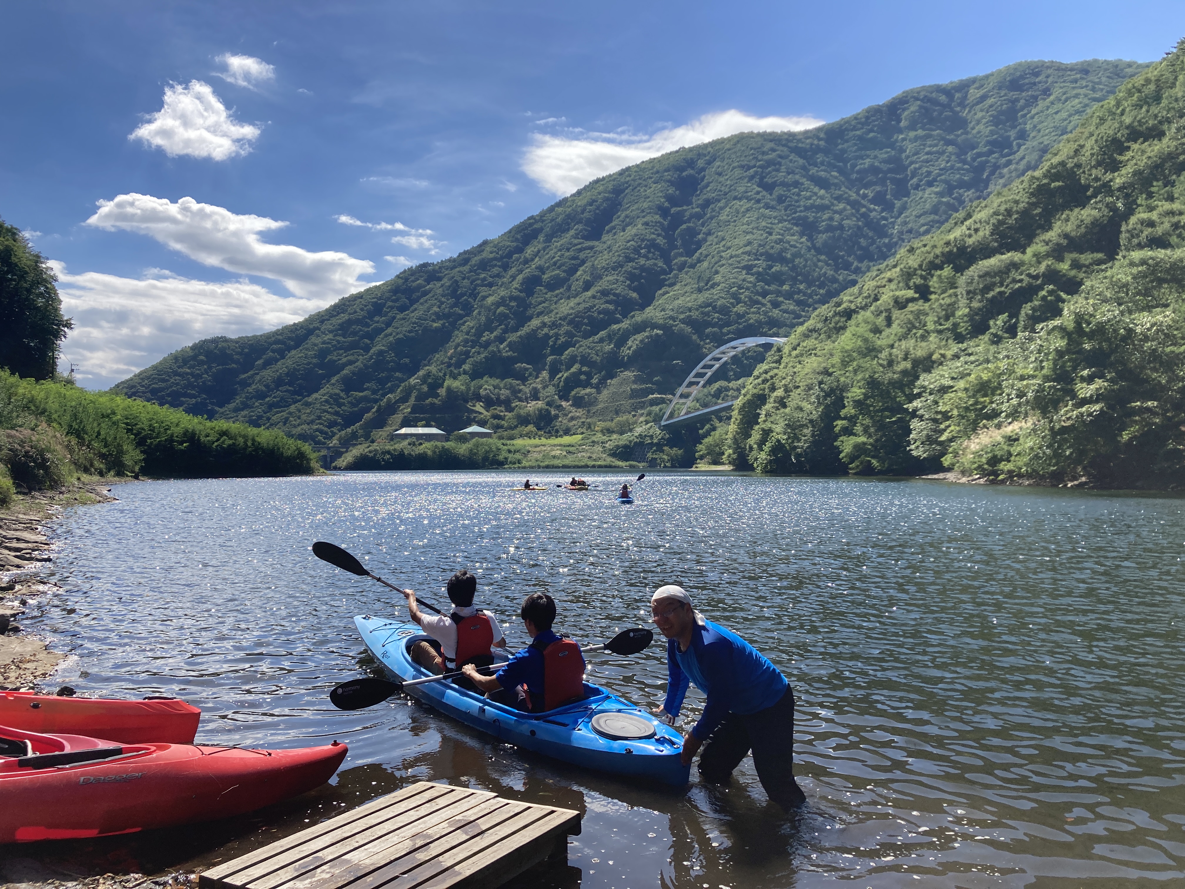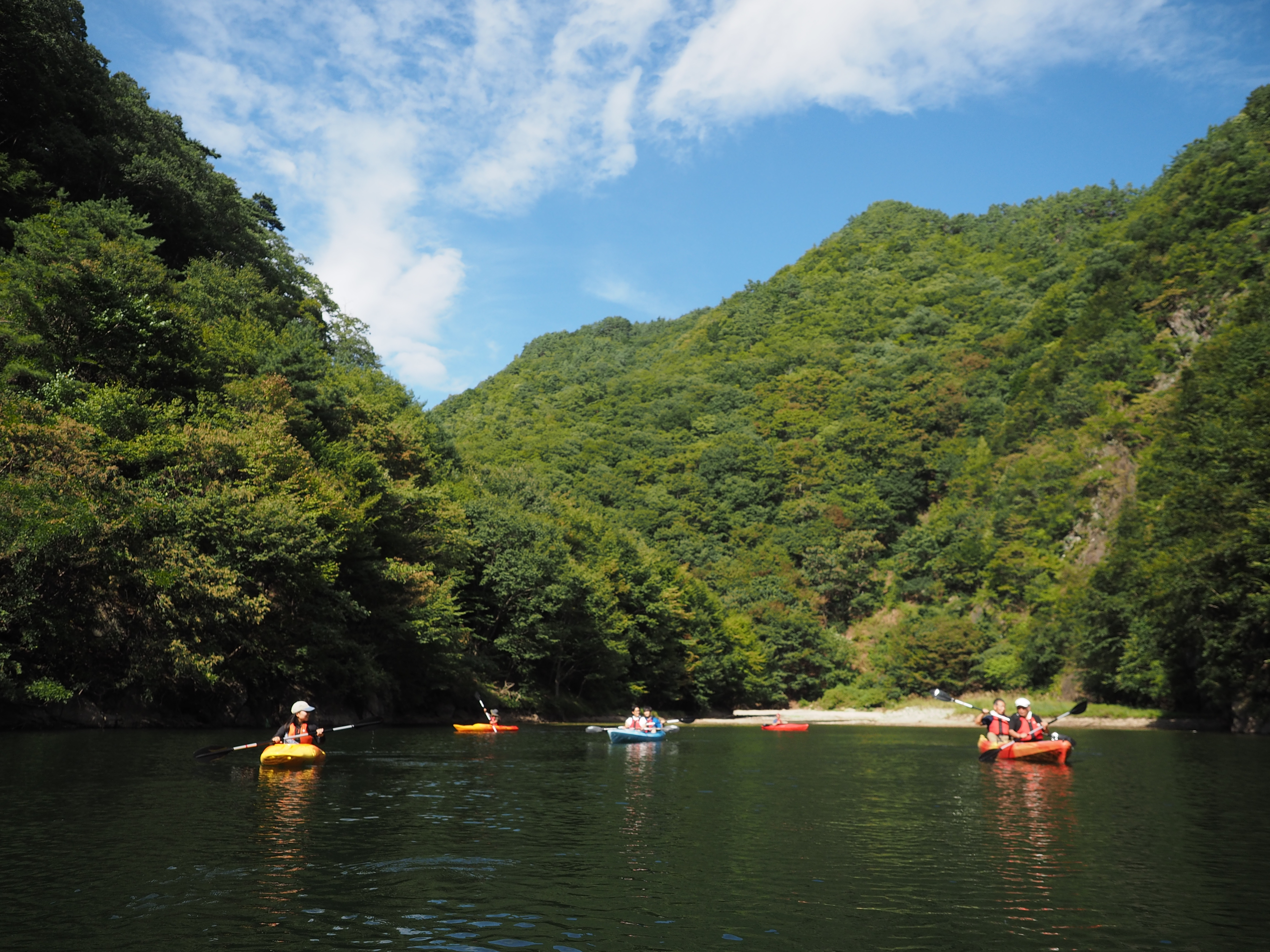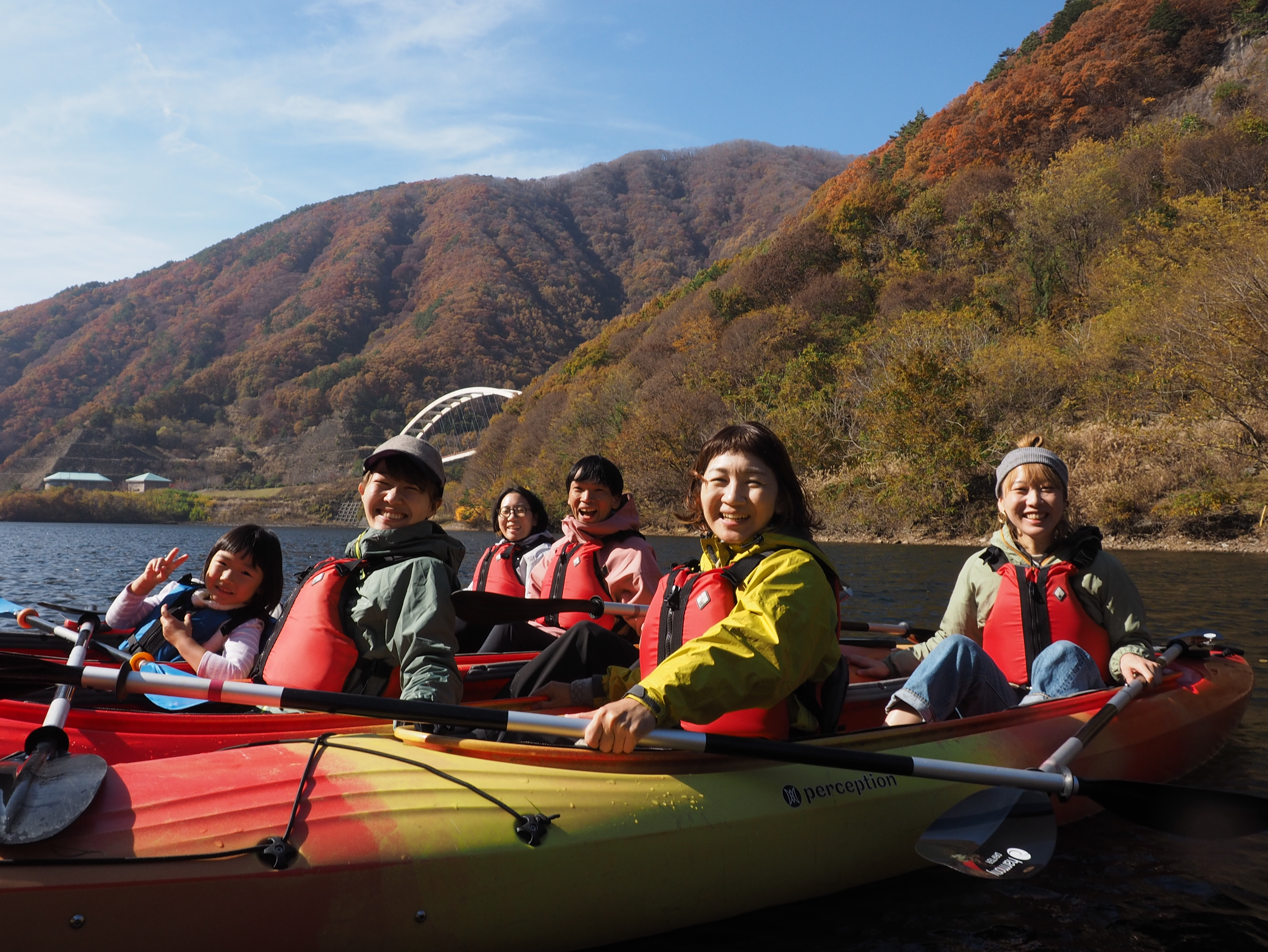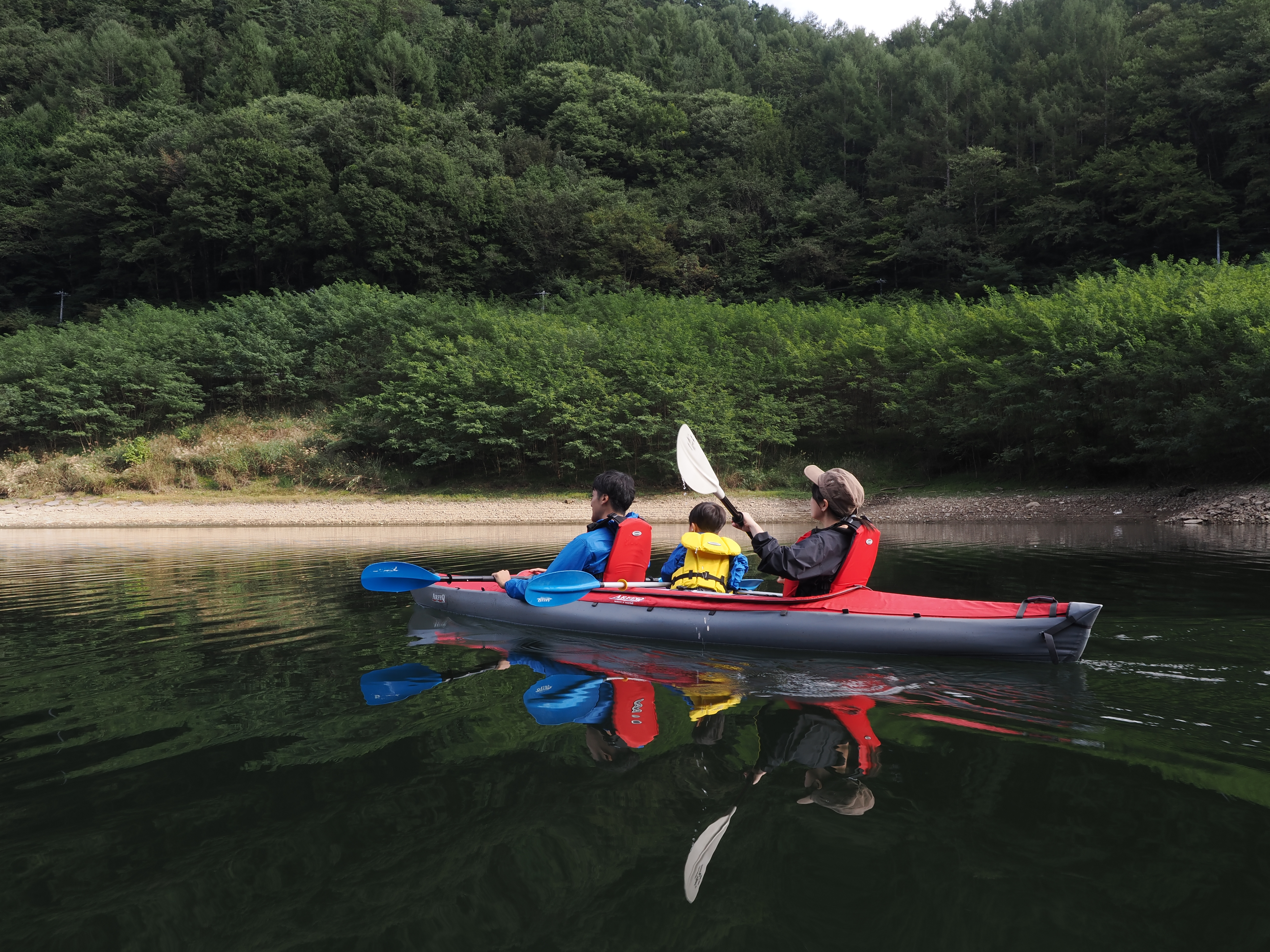 新緑から紅葉まで、漕ぐたびに景色が変わる山深い秘境のダム湖へ。4歳から楽しめる家族の非日常体験。